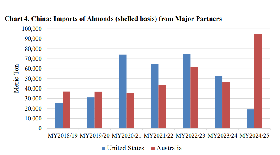 2024年中国是全球第三大巴旦木进口国(以果仁重量计),仅次于印度和欧盟。因为关税政策提高了从美国的运输成本,预计进口量将大幅下降。尽管预计大量美国的生巴旦木将经由东南亚加工后再出口至中国,但行业人士仍担忧该地区的加工能力与中国相比有限,尤其是在需求高峰期。与此同时,中国可能会增加从澳大利亚以及西班牙的巴旦木进口,这两个国家在2025/26季均与美国一样预计将迎来增产。