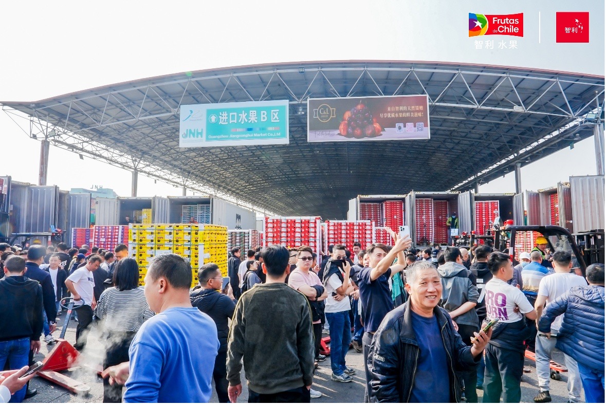 125日,从智利圣安东尼奥港出发的2025/26产季首条“车厘子快线”MSC Lome V号顺利靠泊广州南沙港。370柜(约8000吨)新鲜车厘子经全程冷链从智利运抵广州,经海关查验后通过冷链车运往各地批发市场及冷库。