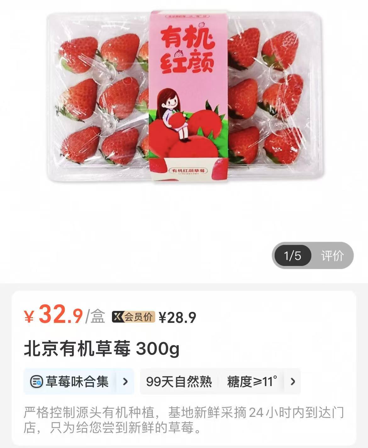 据介绍,正常草莓的生长周期是60天,洛霖农业产销专业合作社基地的草莓会长足100天,酸甜比接近3:7。盒马上架的红颜草莓平均糖度达11度,从采摘到上架只需24小时,零售价在32.9元/300克,折合一斤售价54.8元。