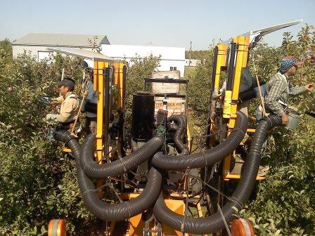 据悉,苹果真空采收机具有三大关键配备:采摘平台、真空接收系统、栈板框输送装置。首先,苹果真空采收机利用自动升降采摘平台来控制采摘高度,该平台通过水力控制,平台两侧各可容纳两名采摘人员,并由无人拖拉机作为驱动驶入苹果采摘区。真空接收系统可以有效地避免苹果遭受机械伤害,苹果仍然通过人工采摘,真空接收系统则负责将苹果完好无缺地送入栈板框中。待框中装满苹果,栈板框输送装置将栈板框移出果园,取而代之的是又一个空的栈板框。